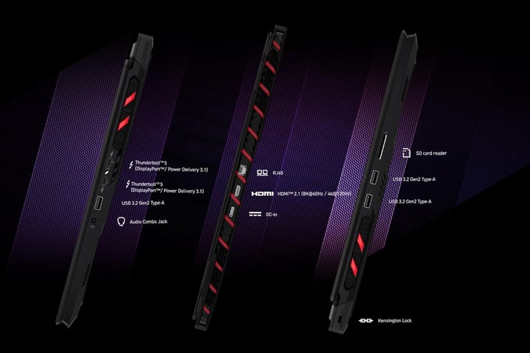 Now we will tell you about the ports of the laptop, you will get 2 display thunderbolt ports in the laptop (3x faster) with the power delivery 3.1, you will get 3 USB ports Gen2 (12x faster), audio combo jack in which you can connect both earphones and headsets, 1 HDMI 2.1 port (4K@120Hz & 8K@60Hz), and you will get an SD card reader, in which you store your memory, you can also refresh your old memories by connecting it to your laptop, their reading ability will be (3x and 12x) faster.
